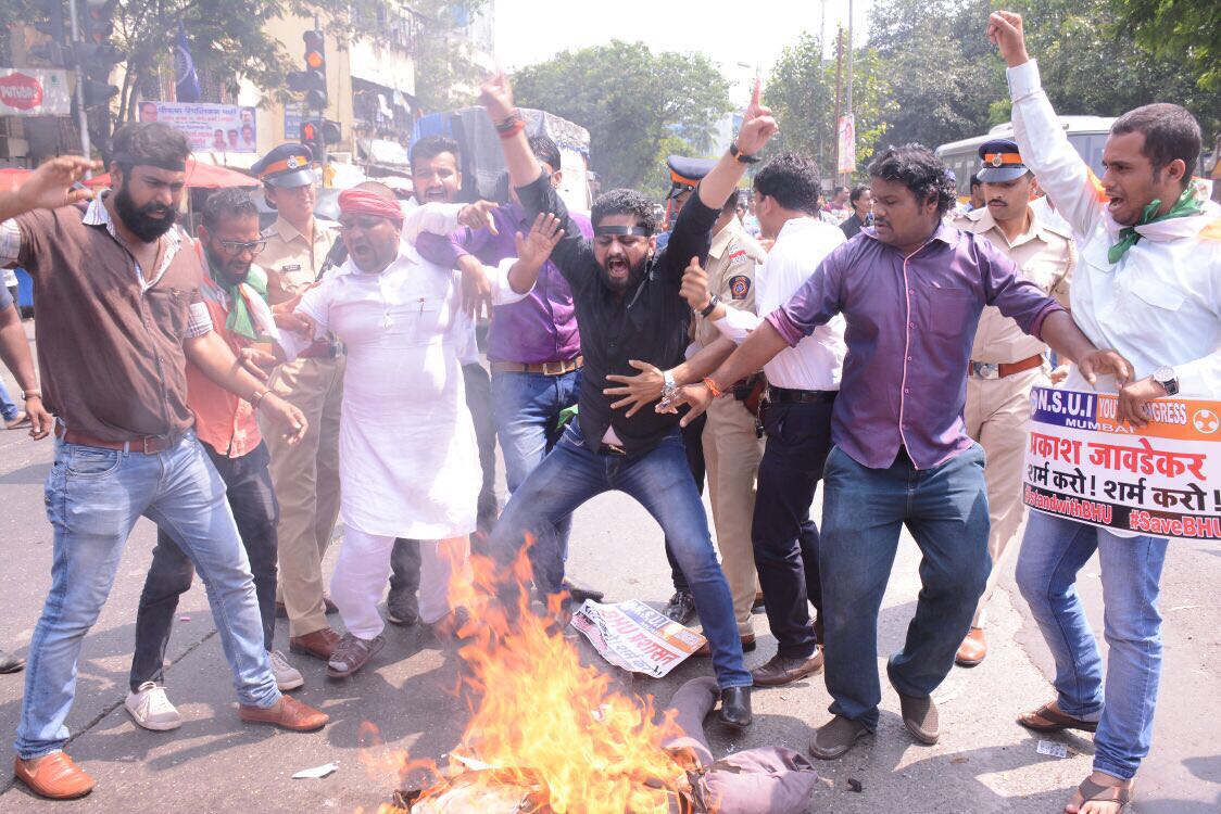 बीते कुछ दिन पहले उत्तर प्रदेश के बनारस हिन्दू विश्व विद्यालय में महिला छात्राओ पर पुलिस द्वारा किये गये लाठीचार्ज की निंदा पुरे देश मे की जा रही है। इसी का नतिजा आज मुंबई विश्वविद्यालय मे दिखाई दिया। मुंबई एनएसयूआई के पूर्व अध्यक्ष तथा मुंबई यूथ कांग्रेस के उप अध्यक्ष सूरज सिंह ठाकुर के नेतृत्व में बड़ी संख्या में कार्यकर्ताओ ने मुंबई विश्वविद्यालय कालिना के बाहर केंद्र और उत्तर प्रदेश की आदित्य योगी सरकार के खिलाफ हल्लाबोल मोर्चा निकाला और केंद्रीय मानव संशाधन मंत्री प्रकाश जावड़ेकर का पुतला फूंका । इस मौके पर सूरज सिंह ठाकुर ने बीजेपी सरकार से घायल छात्राओं को दो दो लाखों रुपए देने की मांग की।और देश के सभी स्कूल कॉलेजों में सीसीटीवी कैमरे लगाये जाये तथा पुलिस प्रोटेक्शन भी दिया जाये ऐसी सरकार ने ठाकुर ने की है । जिन छेड़ छाड़ की घटनाओं के विरोध में बनारस हिन्दू विश्व विद्यालय के छात्राओं ने प्रदर्शन किया उसे गम्भीरता से लिया जाना चाहिए और उनके साथ हुए लाठी चार्ज के दोषियों पर सख्त से सख्त और जल्द से जल्द कार्यवाही होनी चाहिए , पुलिस और बदमाशों के द्वारा के खिलाफ मोर्चा निकालने वाले सूरज सिंह ठाकुर से साथ बड़ी संख्या में पदाधिकारी और कार्यकर्ता मौजूद रहे।