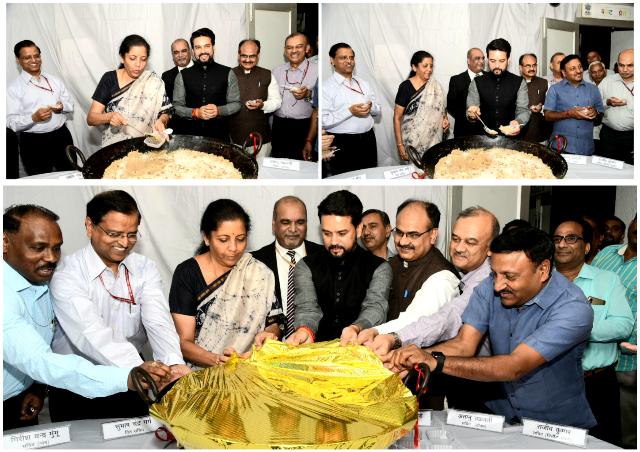 केंद्रीय वित्त और कॉर्पोरेट कार्य मंत्री निर्मला सीतारमण की गरिमापूर्ण उपस्थिति में शनिवार 22 जून के दोपहर नॉर्थ ब्लॉक में हलवे की रस्म के साथ आम बजट 2019-20 की छपाई प्रक्रिया शुरू हो गई।