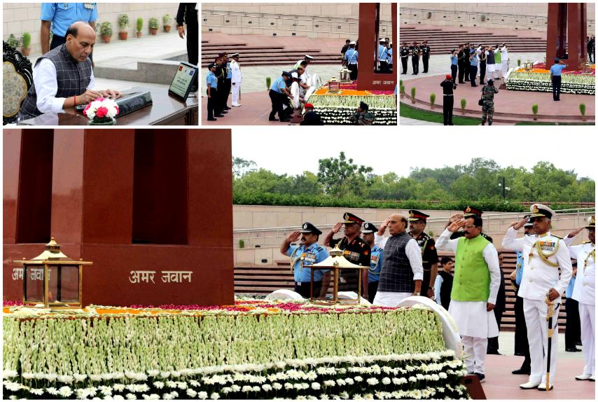रक्षा मंत्री राजनाथ सिंह ने आज नई दिल्ली में कारगिल विजय दिवस की 20वीं वर्षगांठ के अवसर पर राष्ट्रीय युद्ध स्मारक (नेशनल वार मेमोरियल) पर शहीदों को श्रद्धांजलि अर्पित की। इस अवसर पर रक्षा मंत्री ने आगंतुक पुस्तिका में एक संदेश लिखा। रक्षा मंत्री ने आगंतुक पुस्तिका में लिखा, ‘भारत के सम्मान, प्रतिष्ठा एवं गर्व के लिए अपने प्राणों की आहुति देने वाले कारगिल युद्ध के बहादुर सैनिकों को श्रद्धांजलि। उनका पराक्रम और त्याग प्रत्येक भारतवासी के लिए प्रेरणादायक है। कारगिल विजय दिवस की 20वीं वर्षगांठ पर, हम यह संकल्प लेते है कि कृतज्ञ राष्ट्र देश के सम्मान के लिए सर्वोच्च बलिदान करने वाले सैनिकों को कभी नहीं भूलेगा।’