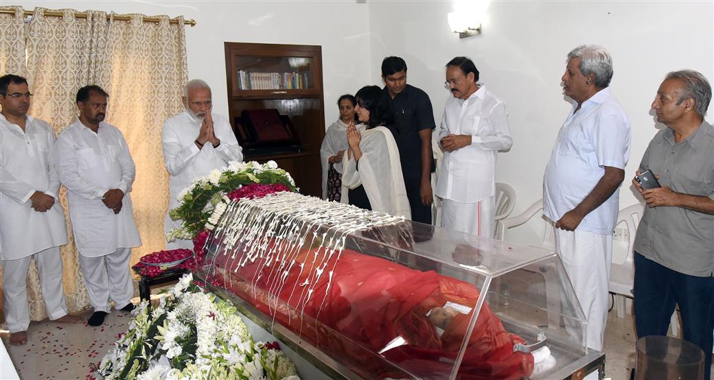 प्रधानमंत्री नरेन्द्र मोदी ने आज पूर्व विदेश मंत्री सुषमा स्वराज के असामयिक निधन पर उनके निवास स्थान पर श्रद्धांजलि अर्पित की।