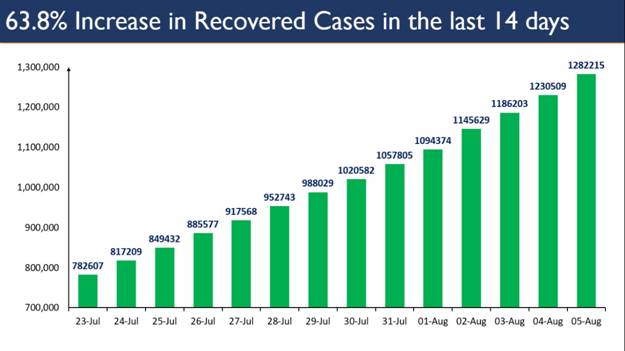 कोविड-19 के मरीजों के ठीक होने की बढ़ती संख्या के साथ पिछले 14 दिनों में इस बीमारी से ठीक होने की संख्या में 63.8%की वृद्धि हुई है जो यह दर्शाती है कि केंद्र सरकार द्वारा "टेस्ट, ट्रैक, ट्रीट" यानी परीक्षण, निगरानी, उपचार की रणनीति से संचालित कोविड-19 मामले पर की गई सही प्रतिक्रिया और प्रबंधन वांछित परिणाम दे रहा है।