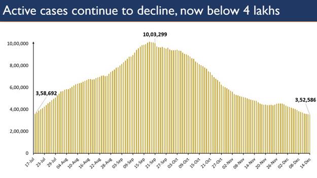 देश में कोविड के सक्रिय मामलों की संख्या सोमवार 14 दिसम्बर 2020 को 3,52,586 हो गई है। कुल पॉजिटिव मामलों में सक्रिय मामलों की हिस्सेदारी घटकर 3.57 प्रतिशत हो गई है, जो पिछले 149 दिनों के बाद सबसे कम है। 18 जुलाई, 2020 को कुल सक्रिय मामले 3,58,692 थे।