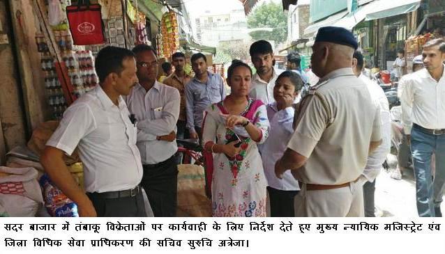 गुरुग्राम 03 जून। हरियाणा राज्य विधिक सेवा प्राधिकरण की और से जिला विधिक सेवा प्राधिकरण, संबध हैल्थ फाउंडेशन, फोर्टिस फाउंडेशन, हरियाणा पुलिस, स्वास्थ्य विभाग, बार एसेासियेशन, जिला प्रशासन, पैनल एडवोकेट की और से 31 मई विश्व तंबाकू निषेध से 5 जून 2017 विश्व पर्यावरण दिवस तक चलाए जा रहे “परिवर्तन एक नई शुरुआत” अभियान में सार्वजनिक स्थानेां पर तंबाकू सेवन व बेचने वालों पर कार्यवाही की जा रही है। इसी के तहत शनिवार को सदर बाजार में तंबाकू बेचने वालों पर जब कार्यवाही की गई तो तंबाकू विक्रेताओं में हड़कंप सा मच गया और वे अपनी दुकानों को बंद कर भाग गए।