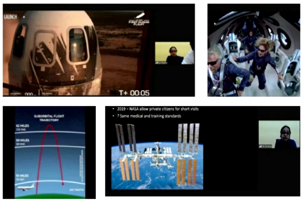 अंतरिक्ष पर्यटन या वाणिज्यिक अंतरिक्ष यात्रा की अवधारणा नई नहीं है और इसके विचार की अवधारणा से वास्तविकता तक के इतिहास पर डॉ. पुनीता ने ऑनलाइन व्याख्यान में चर्चा की। अंतरिक्ष पर्यटन, मनोरंजन के व्यावसायिक उद्देश्यों के लिए अंतरिक्ष यात्रा है। डॉ. पुनीता ने बताया कि अंतरिक्ष पर्यटन हाल ही में दो अमेरिकी अरबपतियों, रिचर्ड ब्रोंसन और जेफ बेजोस की वजह से खबरों में रहा है, जो अपने निजी रॉकेट और विमान का उपयोग करके पर्यटकों के रूप में अंतरिक्ष में गए थे।