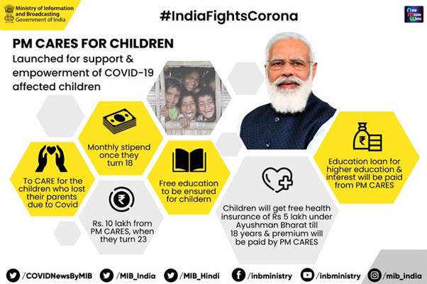 बच्चों के लिए पीएम केयर्स योजना की शुरुआत 29 मई 2021 को प्रधानमंत्री नरेन्द्र मोदी द्वारा की गई थी। यह योजना विशेष तौर पर उन बच्चों को सहायता उपलब्ध कराती है, जिन्होंने 11 मार्च 2020 के बाद से शुरू होने वाली अवधि के दौरान अपने माता-पिता या कानूनी अभिभावक अथवा दत्तक माता-पिता या फिर जीवित माता-पिता दोनों को कोविड-19 महामारी से खो दिया है। इस योजना का उद्देश्य बच्चों की व्यापक देखभाल करना और उनकी सुरक्षा सुनिश्चित करना तथा स्वास्थ्य बीमा के माध्यम से उनकी सेहत का ख्याल रखना, उन्हें शिक्षा के माध्यम से सशक्त बनाना और उनकी 23 वर्ष की आयु पूरी होने तक वित्तीय सहायता के साथ उन्हें आत्मनिर्भर बनने के लिए तैयार करना है।