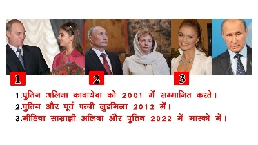 अलिना विख्यात अंतर्राष्ट्रीय जिमनास्ट (व्यायामी) हैं। दिखने में रूपसी हैं। लावण्यमी भी। डीलडौल में सौष्ठव, कदकाठी में चुंबकीयता भरपूर है। यूं पुतिन को अपने पुरुषत्व पर नाज है। अश्व से समता करते हैं। परदारागमन के कारण तीस वर्षों तक व्याहता रही 65-वर्षीया अर्धांगिनी लूडमिला ने अब तलाक दे दिया। उनकी दो बेटियां और दो नातिनें भी अलग हो गयीं। लुडमिला सोवियत सेना में अफसर थी, जब पुतिन सोवियत कम्युनिस्ट गुप्तचर एजेंसी में केजेबी में अफसर थे।
