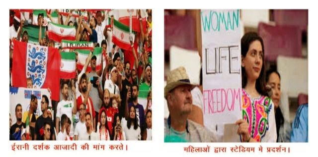 हालांकि लोकतन्त्र के प्रेमियों को ताज्जुब हुआ जब सब के बाद भी इंग्लैंड टीम ने अपना राष्ट्रगान गाया : “ईश्वर बादशाह को सलामत रखे।” हमदर्दी में टाल सकते थे। आवाज धीमी या मंद हो सकती थी। उनका ईरान की जनता से ढकोसला किया कि ब्रिटेन मानवाधिकार के पैरोकार हैं। ईरान का तेल उनकी महारानी की हुकूमत और वित्त को बचाता रहता था। हालांकि ये साम्राज्यवादी शोषक ही रहे। मशहूर ईरानी फुटबॉलर एहसान हजरुकी और ईरानी टीम के पुर्तगाली कोच कालोर्स मेनुअल क्वेरोज ने कहा : “खिलाड़ियों के इस प्रतिरोध-प्रदर्शन का हमदर्द हैं।” स्टेडियम के सामने वाला मेट्रो स्टेशन झंडो से अच्छादित था। उन पर लिखा था : “ईरान को न्याय मिले। ईरान आजादी पाये।” दर्शक बहमान अहमदी ने कहा : “हम दुनिया को यह सच जताना चाहते हैं।” खिलाड़ी सरदार अजमाउन ने निर्भीक होकर स्पष्ट कहा : “डर कैसा? क्या होगा”? राष्ट्रीय टीम से निष्कासित ही करेंगे। यह बहुत ही छोटी कीमत होगी। ईरानी युवतियों के बालों का एक रेशे की तुलना में। ईरानी नारी-मुक्ति जिंदाबाद।” मेहंदी तोराबी ने इंग्लैंड पर दो गोल ठोके। पर हर्ष व्यक्त करने से इंकार कर दिया।