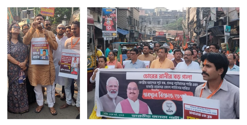 पश्चिम बंगाल में भ्रष्टाचार, गुंडागर्दी, शिक्षक भर्ती घोटाला, हावड़ा नगर निगम में अवैध रूप से हुए नौकरी और निगम के चेयरमैन - उप चेयरमैन द्वारा किये अवैध निर्माण के खिलाफ हावड़ा ज़िला भाजपा के आह्वान पर पंचनंतल्ला स्थित ज़िला कार्यालय से एक प्रतिवाद जुलूस निकाला गया।
