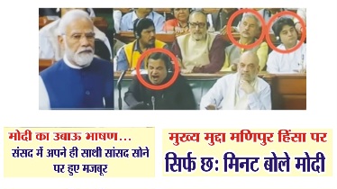 प्रधानमंत्री नरेंद्र मोदी ने लोकसभा में 10 अगस्त को अविश्वास प्रस्ताव पर रिकार्ड तोड़ भाषण दिया। मोदी करीब 02 घंटा 13 मिनट तक लोकसभा में बोले। यह भाषण देश के इतिहास में सबसे लंबा भाषण है। अब इस भाषण की अंदर की मंशा को भी समझने की कोशिश करते हैं। दरअसल इससे पहले देश के पूर्व प्रधानमंत्री लाल बहादुर शास्त्री ने संसद में 02 घंटा 12 मिनट का भाषण दिया था। मतलब मोदी का भाषण 01 मिनट ज्यादा रहा। कहा जा सकता है कि मोदी ने यह लंबा भाषण इसलिए दिया ताकि एक पूर्व प्रधानमंत्री का रिकार्ड तोड़ा जा सके। क्योंकि भाषण में मोदी ने जिन बातों का जिक्र किया वह केवल अपनी सरकार की उपलब्धियों पर था, जबकि विपक्ष मणिपुर मामले पर अविश्वास प्रस्ताव लाया था और उसी पर पीएम मोदी को बुलवाना चाह रहा था लेकिन मोदी मणिपुर पर 96 मिनट के बाद बोले जब तक तमाम विपक्ष वाकआउट कर चुका था। मोदी का भाषण इतना उबाउ था कि अपनी ही सरकार के तमाम मंत्री, सांसद उबते, सोते हुए दिखाई दिये। जिनमें नितिन गडकरी, ज्योतिरादित्य सिंधिया, अश्विनी कुमार जैसे मंत्री भी शामिल थे। अब सवाल उठता है कि जब मोदी को मुख्य मुददे पर बोलना ही नहीं था तो इतना लंबा भाषण देने की क्या जरूरत थी।