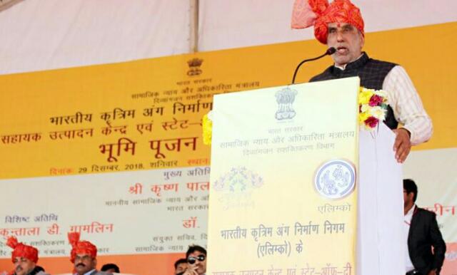 केंद्रीय सामाजिक न्याय एवं अधिकारिता राज्य मंत्री कृष्ण पाल गुर्जर आज फरीदाबाद के बल्लभगढ के गांव नवादा, तिगांव में मुख्य अतिथि के रूप में एलिम्को की सहायक उत्पादन ईकाई एवं अत्याधुनिक अंगयोजन केंद्र के ‘‘भूमि पूजन’’ समारोह शामिल हुए। आर्टिफिशिएल लिम्ब्स के फिटमेंट के लिए अत्याधुनिक पुनर्वास केंद्र तथा आर्टिफिशियल लिम्ब्स मैनुफैक्चरिंग कॉरपोरेशन ऑफ इंडिया (एलिम्को) के लिए शिलान्यास इस वर्ष 16 जून को किया गया था।