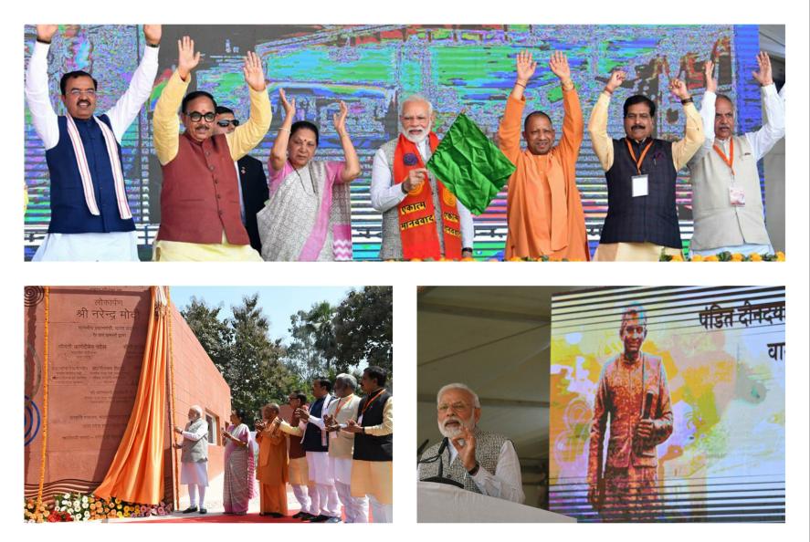 प्रधानमंत्री नरेन्द्र मोदी ने वाराणसी में पंडित दीनदयाल उपाध्याय की प्रतिमा का अनावरण किया और दीनदयाल उपाध्याय स्मारक राष्ट्र को समर्पित किया। उन्होंने तीन ज्योर्तिलिंग तीर्थ स्थलों-वाराणसी, उज्जैन और ओंकारेश्वर को जोड़ने वाली तीसरी कार्पोरेट ट्रेन –महाकाल एक्सप्रेस को भी झंडी दिखाकर रवाना किया। उन्होंने 430 बिस्तरों वाले सुपर- स्पैशल्टी सरकारी अस्पताल सहित 36 विकास परियोजनाओं का उद्घाटन किया और 14 विकास परियोजनाओं की आधारशिला रखी।