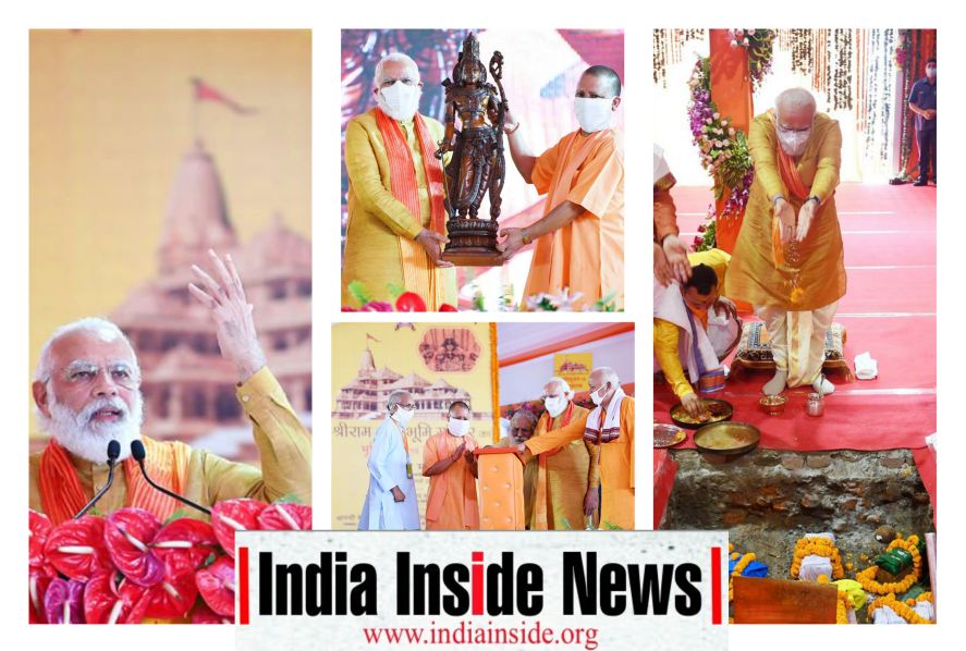 प्रधानमंत्री नरेन्द्र मोदी ने बुधवार 05 अगस्त 2020 को अयोध्या में 'श्री राम जन्मभूमि मंदिर' में भूमिपूजन किया।